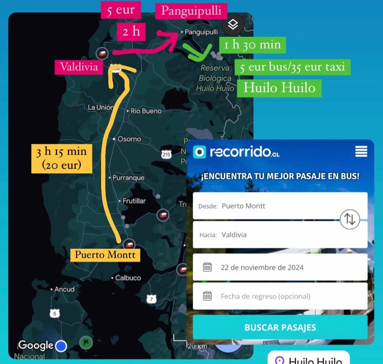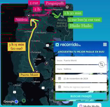 Iz Valdivije možete uzeti privatni taksi ili možete ići javnim autobusom do Panguipullija (5 eura, 2 sata). Iz Panguipullija do Huilo-Huilo još jedan autobus je bio 5 eura, vožnja 1 sat i 30 minuta, ili s privatnim taksijem 35 eura i 1 sat. Posljednja dva autobusa bila su malo neudobna jer su bila manja.